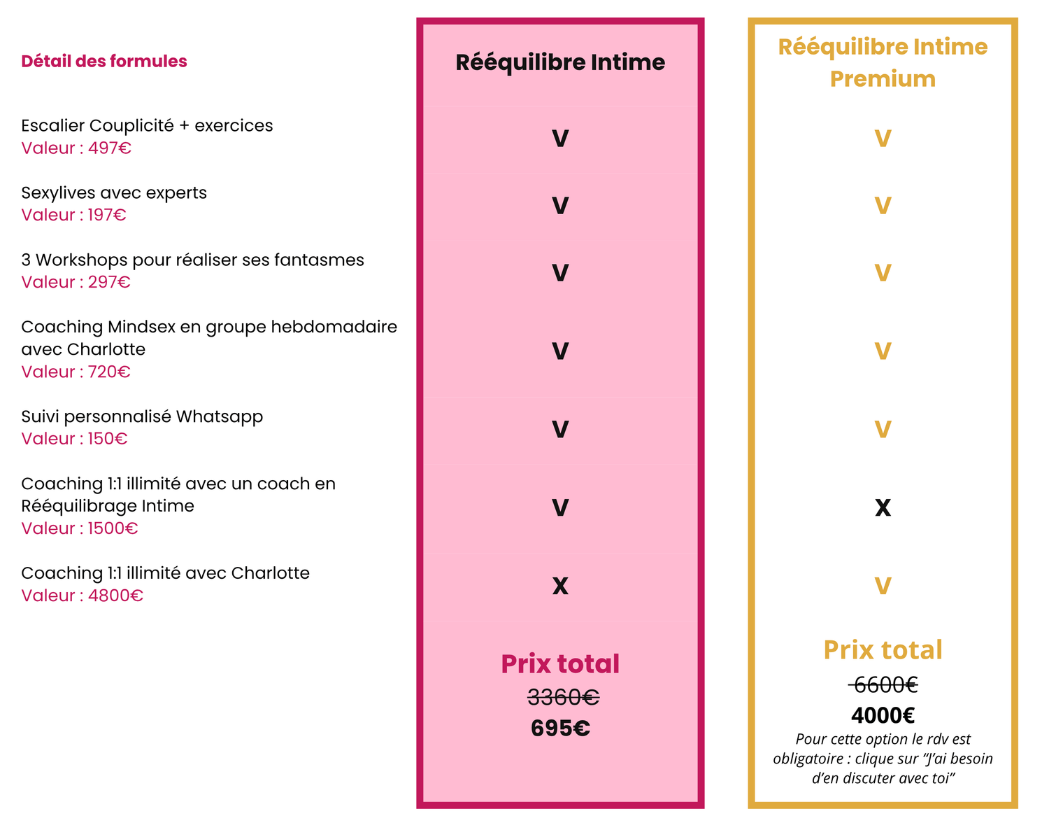 Avec Rééquilibre Intime, rien qu'avec le contenu du programme + le coaching de groupe tu rentabilises ton investissement. Et nous avons fait le choix de proposer un cadre d'accompagnement personnalisé qui coûterait des milliers d'euros dans d'autres programmes.